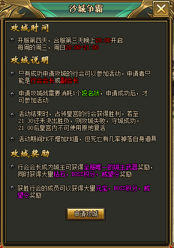 2. 活动开启前需要会长或者副会长去沙巴克沙城争霸NPC处报名,报名需要消耗投名状。