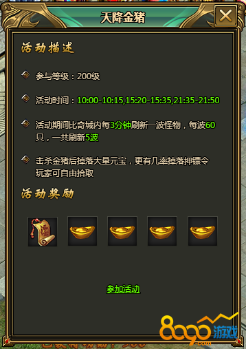 当8090《滔天传说》玩家等级达到200级时可在天降金猪活动时间通过天降金猪NPC进行天降金猪。