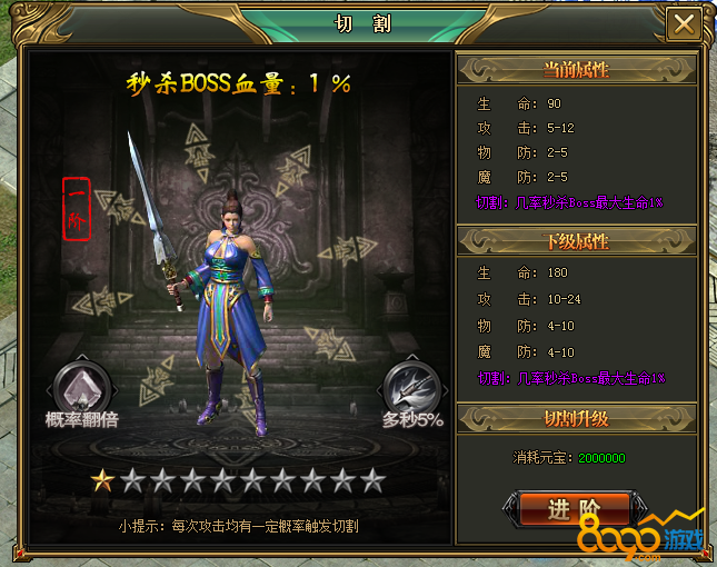 切割礼包,可购买到概率翻倍,多秒5%血量。
