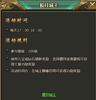 当玩家等级达到200级时可在每天17:00-18:00参加膜拜城主活动。
