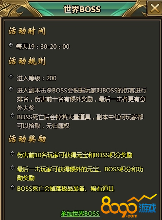 1. 伤害前十可获得元宝、BOSS积分奖励。