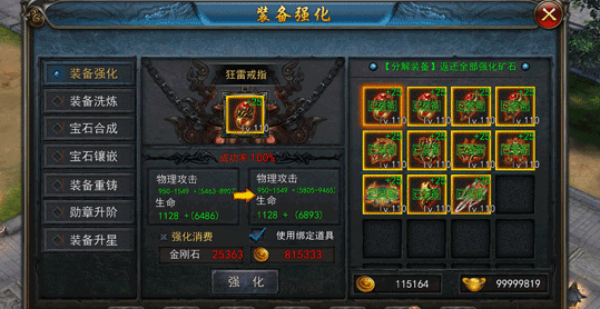 通过强化装备,可以增幅装备的属性值,强化武器需要乌金矿,强化防具需要玄铁矿,特别说明的是,当“武器”强化到一定等级,会有炫酷的强化特效,非常拉风。