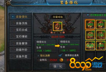 通过强化装备,可以增幅装备的属性值,强化武器需要乌金矿,强化防具需要玄铁矿,特别说明的是,当“武器”强化到一定等级,会有炫酷的强化特效,非常拉风。