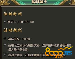 当玩家等级达到200级时可在每天17:00-18:00参加膜拜城主活动。