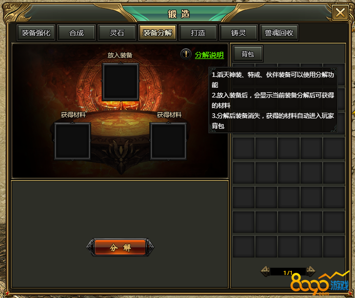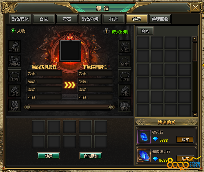 搜索"8090网页游戏"在8090滔天传说游戏中,装备锻造是提升属性的重要方式,锻造系统功能包含了装备强化、合成、灵石、装备分解、打造、铸灵和魂兽回收七大功能。
