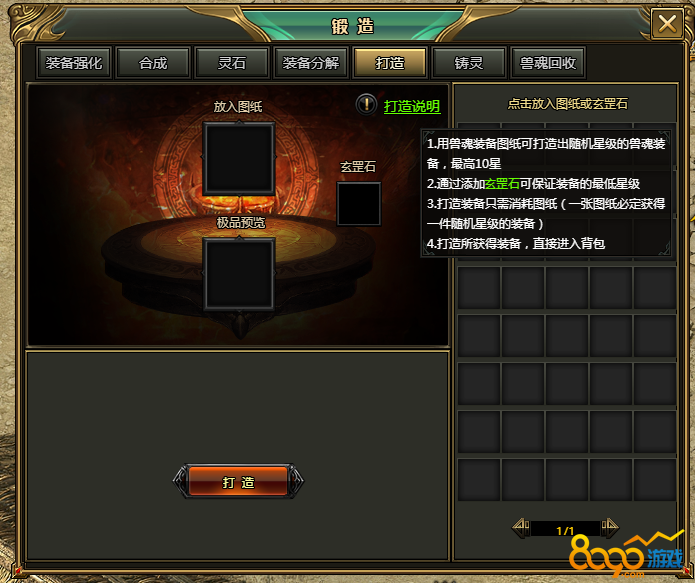 1. 可通过兽魂图纸,打造兽魂装备。可添加玄罡石来保底兽魂装备的最低星级