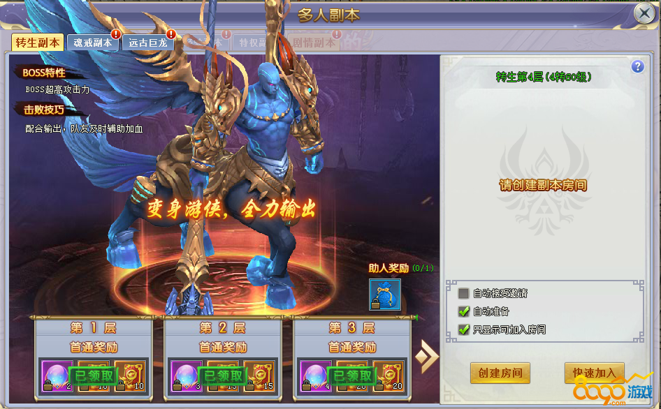 3转60级的BOSS,此BOSS的特性是对玩家造成百分比的伤害,玩家除非攻击足够高能快速击杀BOSS否则需要与其他玩家组队,玩家需要轮流吸引BOSS的攻击并且变身圣灵进行加血。