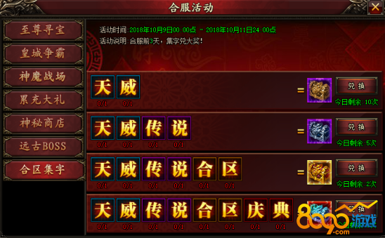 玩法:玩家通过击杀小怪、精英、BOSS收集字帖,达到相应条件兑换相应奖励,每日兑换有上限