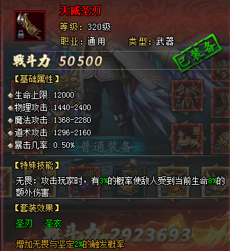 首先天威装备一共有10件,每件装备增加的属性都是非常厉害,而且每件装备都有非常强悍的特殊技能,天威圣刃和天威圣衣是一套的,还有套装效果。