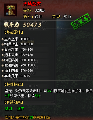 天威圣衣增加的战斗力也有5万,圣衣加的属性不仅有生命值还有各种攻击属性和防御属性,甚至还有暴击几率。有特殊技能坚定。