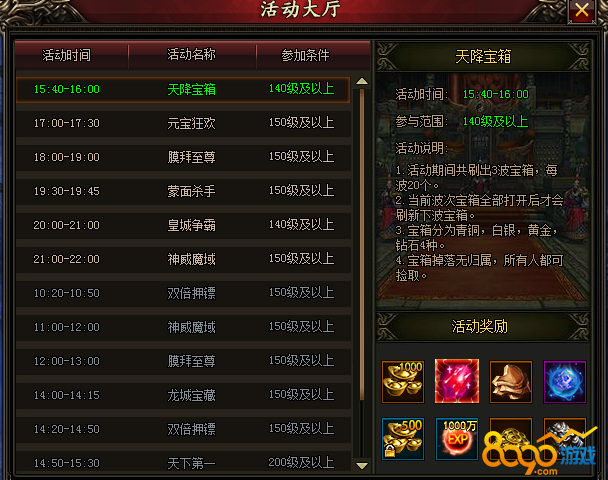 天降宝箱活动是每天的15:40~16:00进行。140级以上就可以参加,许多蕴含宝物的宝箱在场景里面出现,玩家们进入场景后就可以自行寻找宝箱来打。 宝箱宝出来的奖励没有归属,玩家可以随便捡取。所以这也是一个大家互助互利的活动。
