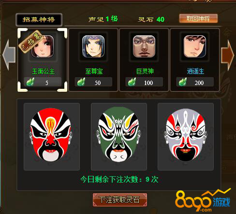 玩家每天有十次“博天命”的机会,用完次数之后,只能等第二天恢复次数。在招募神将系统中,玩家也可以进行“博天命”的下注,只是这里的“博天命”有些特殊,每次下注无论是否出现相同脸谱,玩家都只能得到灵石奖励。