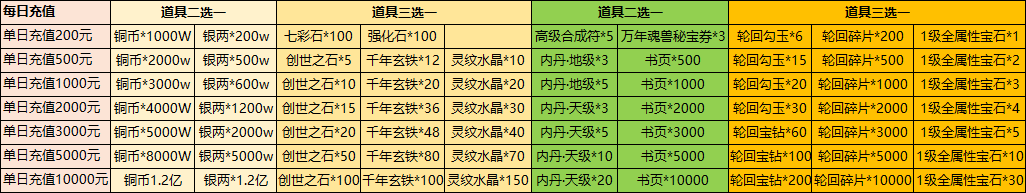 二、单日充值(每日充值,满足即可申请。奖励发放后,玩家自行在游戏内选择道具)