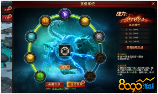 主界面可以查看圣兽的战力、属性,还可以升级圣兽、镶嵌灵纹和预览圣兽技能。