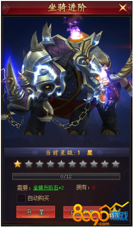 升阶消耗坐骑升阶石,每次升阶可获得一定范围内的成长值,成长值满时可点亮一颗星。在三阶之前点亮十颗星可直接升到下一阶,三阶开始点亮十颗星后还需要使用坐骑突破钥匙进行突破,突破成功后坐骑才会升至下一阶。