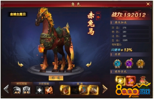 搜索"8090网页游戏"在8090天外飞仙重置版游戏中,玩家收集齐12件紫装后可获赠赤兔马、开启坐骑系统,点击主界面下方的【角色】图标后选中坐骑页签可进入坐骑主界面。