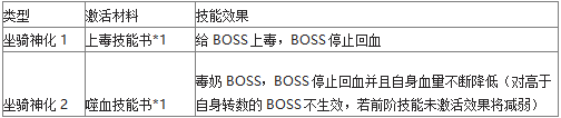 坐骑神化2噬血技能书*1毒奶BOSS,BOSS停止回血并且自身血量不断降低(对高于自身转数的BOSS不生效,若前阶技能未激活效果将减弱)