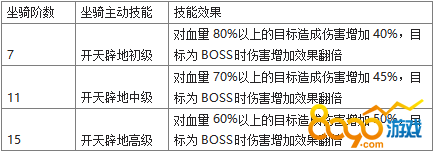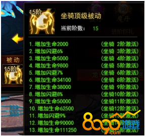坐骑升阶技能分为主动技能及被动技能,当玩家坐骑升到一定的阶数时,可消耗技能书激活相应技能;