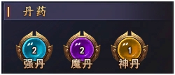 坐骑升至4阶时,开启丹药玩法,玩家可使用三种丹药增加坐骑固定值或百分比属性,随着坐骑阶数的提升,玩家可使用的丹药数量也会增加。