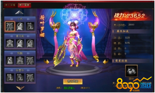 美人主界面可以查看当前美人阶数、属性、战力、技能、时装以及外观。点击主界面下方的美人头像可切换查看对应美人信息。
