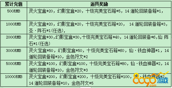 活动内容:活动期间,累计充值达到对应要求即可获得超值奖励,幻影宝盒、灵火宝盒、十级完美宝石箱、神·铁血神器、14道轮回装备箱、阵石等超值奖励大赠送。
