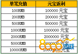 活动内容:活动期间,单日单笔充值达到对应要求即可获得100%的元宝返利,活动仅限3天!
