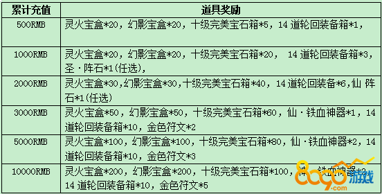 活动内容:活动期间,累计充值达到对应要求即可获得超值奖励,幻影宝盒、灵火宝盒、十级完美宝石箱、神·铁血神器、14道轮回装备箱、阵石等超值奖励大赠送。