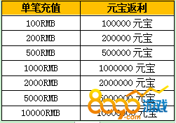 活动内容:活动期间,单日单笔充值达到对应要求即可获得100%的元宝返利,活动仅限2天!