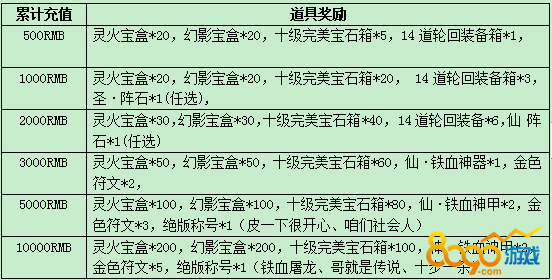 活动内容:活动期间,累计充值达到对应要求即可获得超值奖励,幻影宝盒、灵火宝盒、十级完美宝石箱、神·铁血神器、14道轮回装备箱、阵石等超值奖励大赠送。
