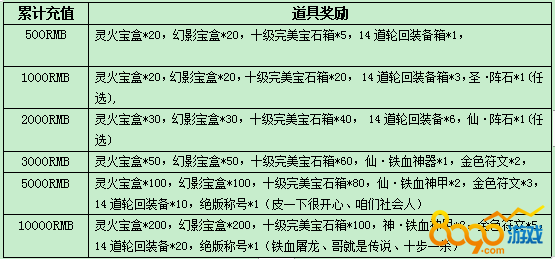 1.活动奖励取最高档,比如玩家8月21日-8月23日期间累计充值达到10000RMB,只可获得灵火宝盒*200,幻影宝盒*200,十级完美宝石箱*100,神·铁血神甲*2,金色符文*5,绝版称号*1,14道轮回装备*20(铁血屠龙、哥就是传说、十步一杀)