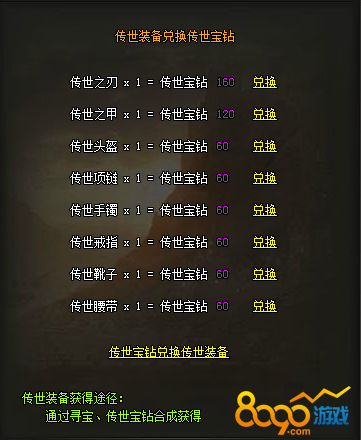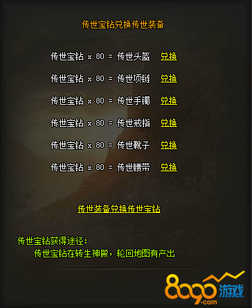 传世装备除了可以通过寻宝获得,还可以用传世宝钻在土城“传世装备”NPC处进行兑换。每花费80个传世宝钻就可兑换1件除传世武器和衣服之外的任意部位的1件传世装备。另外传世宝钻还可以用来强化传世装备。在“传世装备”NPC处,除了可以用传世宝钻兑换传世装备,还可以将多余的传世装备兑换为传世宝钻。除了这种方法外,传世宝钻在转生神殿和轮回地图也有产出。