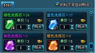这个功能还是挺方便快捷的,唯一缺点就是费钱钱哈。当你洗练的时候,道具不够了,可以通过洗练页面的右下角选择快速购买。当然,您也可以勾上自动购买,没有道具的时候系统自动帮你买了,这样就不用再点开页面买多一次,但同样您的钱钱会被烧得很快哦。
