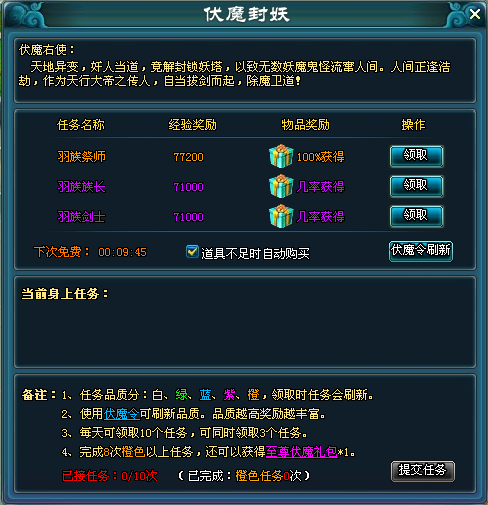 任务品质分:白、绿、蓝、紫和橙,领取时任务会刷新,当然了使用伏魔令可以刷新品质,品质越高奖励也就越丰厚,同时只要你完成8次橙色以上的任务,还能获得至尊伏魔礼包一份。