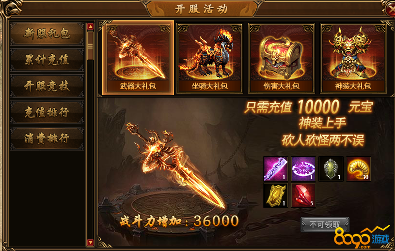 活动内容:活动期间,可以花费少量元宝购买极品神装礼包以及各种稀有道具,快速提升实力!