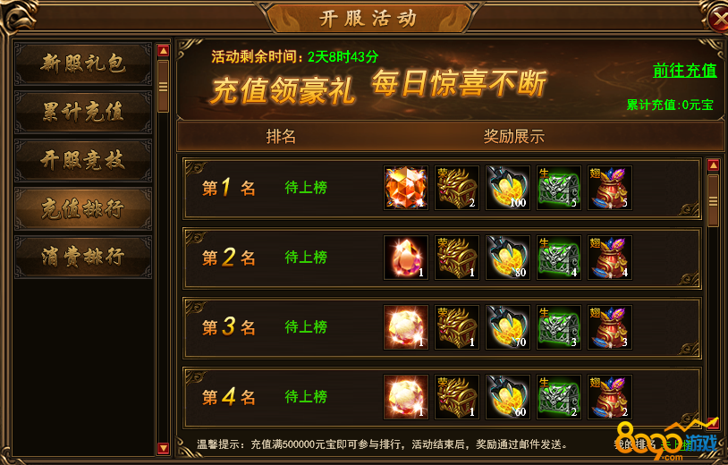 活动期间内,累计充值金额满500000元宝即可上榜,活动结束后奖励通过邮件形式发送。