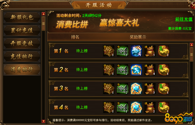活动期间内,累计消费金额满500000元宝即可上榜,活动结束后奖励通过邮件形式发送。