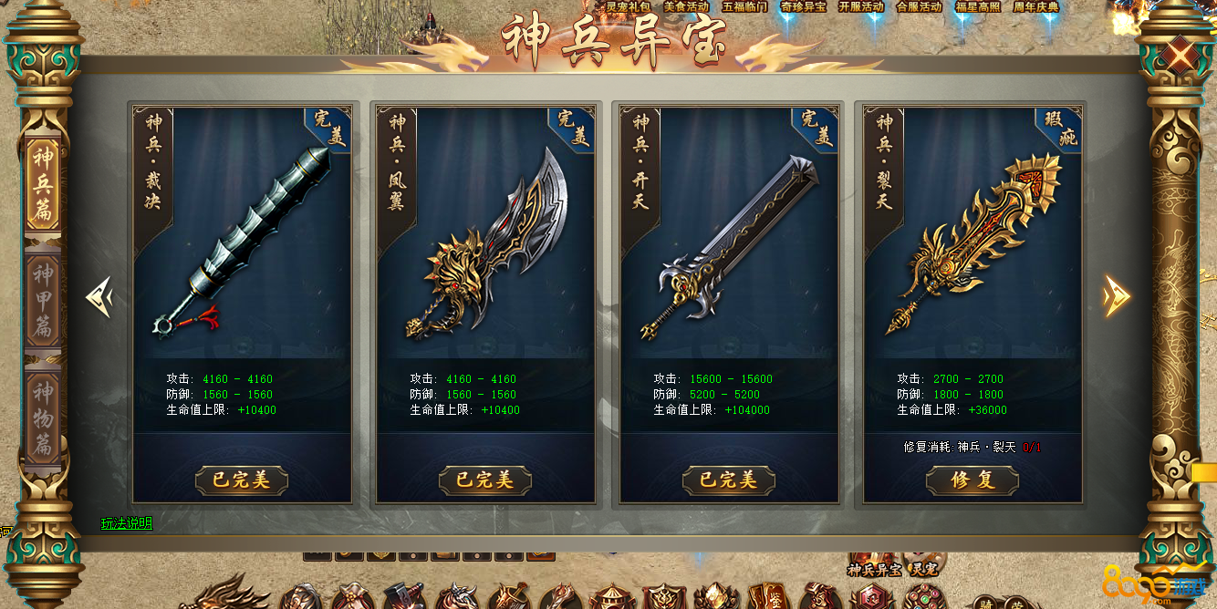可通过收集神兵,神甲,神物激活对应的神兵异宝。