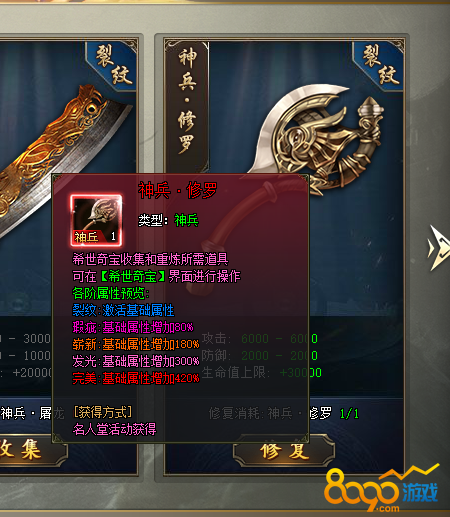 秘境中会再神兵,神甲,神物守护兽中随机刷新一只,玩家击杀有几率掉落一件神器。