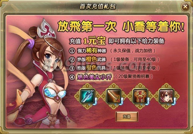 活动内容:放飞第一次小乔等着你。新区服务器开启之后,第一次在新区充值,无论充值金额多少,都能额外获得一份丰厚的首充礼包一份。