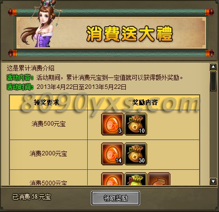 活动内容:活动期间,玩家消费一定的元宝数量,即可获得额外奖励!奖励可以累计领取,如消费达到50000元宝,玩家点击领取奖励,就可以获得全部奖励。