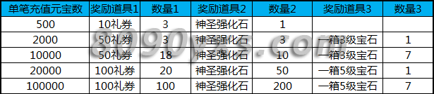 活动内容:活动期间,单笔充值元宝满足条件即可获赠超值道具!