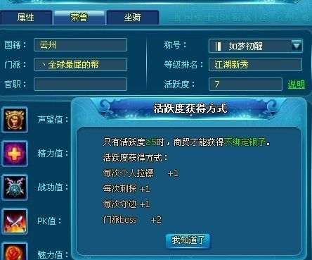 试炼副本:经验较多,建议组5人队或者单刷。建议开双。每天进入3次。 活动有循环任务,门派BOSS,个人拉镖,慧眼识英雄,篝火,商贸。 循环任务: ①六道隐夕:声望,经验和银币每天10次,都是翻倍的喔,一定要做。 ②守卫国土:蛇牙关吴用接任务,每天4次,经验翻倍,,每6分钟汇报一次,千万不要超过汇报后的3分钟喔,那样子经验是减半的。而且这个时候杀掉外国人,得到的功勋是双倍,喜欢PK的玩家可以直接在蛇牙关杀人。 ③刺探军情:蛇牙关吴用接任务,一共4次,每个外国2次,不过要注意,每日的1:00-12:00不能进行刺探军情的哦,经验一般,有时间可以做做。出国有危险,任务请谨慎 门派BOSS:帮主召唤,接到召唤提示可以回到帮派领地击杀BOSS,可获得帮贡。 个人拉镖:获得绑定银两及经验,镖车分为白、绿、蓝、紫、橙,白色奖励最少,橙色最多,可使用换车令改变镖车颜色。每天三次。 慧眼识英雄:对玩家崇拜或鄙视,可获得经验。每天10次。不过崇拜经验要比鄙视高出点。 篝 火 :在王都篝火附近打坐,获得经验。前提是饮用果酒,每瓶持续时间5分钟,连续饮用时间可叠加,每天最多饮用5瓶。组队饮用,经验更佳。果酒也分品质的,从低到高依次为 白色,绿色,蓝色,紫色,橙色。果酒在魔神之殿副本和试炼副本最后的BOSS都有一定的爆出。 商 贸:在王都富商领取商票,购买物品后去大荒域西域商人出售,再从西域商人购买物品回,王都富商出售,再交还商票,获得20两银子和20文帮会资金。每天可完成三次。 注意一点,只有当天活跃度≥5时才能获得不绑定银两,获得方法如下: