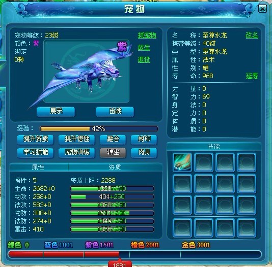 天之刃橙色宠物打造方法:系统送给玩家的是资质是1000以下的,也就是绿色的。这里提醒下玩家们,其实系统有很多礼包送给玩家的哦!只要把这些礼包领了,就能得到数量较多的比如洗灵丹和提悟性符,这些很实用的东西。前期的新手任务也会给好几个哦。有了上面说的这两种东西那会给玩家省一大笔开支哦!(*^__^*) 普通宠物的资质上限是1500 花几个系统送的洗灵丹轻松把资质洗到1450+ ,下一步就是开始提悟了。只要把悟性提到4以上,哪怕是失败也不会掉回零的。四到五的成功率极其高,所以说四是关键,运气不差的话系统送给玩家的洗灵丹就够提到五了。接下来就是稍微花几块钱,买几个中级提悟符继续提悟性。悟性提到七后宠物的资质可以+600,加上之前洗灵时候的1450资质,一个橙色宠就出来了!