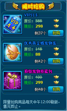 回馈广大天之刃玩家,开服三天内商城将开放五折VIP月卡及6折黄金宠,其中还有7.5折的顶级宠物技能包(可开出宠物群体主动技能)!机不可失时不再来,你还等什么呢?赶快抢购吧!开服第四天后抢购专区里会刷新各种折扣道具,甚至有可能刷新免费道具哦!