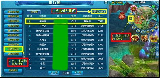 进入游戏后,点击右上方的【榜】,选择【宠物排行榜】,点击【我要参与排名】。在活动时间结束后,宠物排行榜前10名的玩家可获得丰厚奖励。