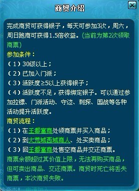 1、最好是等活跃度大于5以后再跑商,那时完成任务获得银子是不绑定的(活跃度是可以在人物属性→荣誉处查看的)。