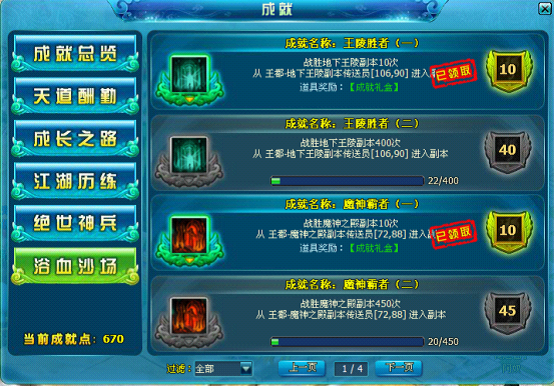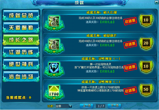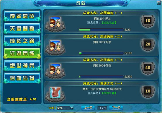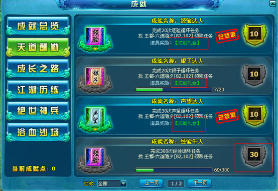 这一节主要是考验玩家在对每天的循环人物的完成进度的情况,前面三项的奖励有成就礼盒和10点声成就值,考验玩家的正是是否有坚持每天完成这重复枯燥的任务,但人物虽枯燥,完成任务后获得的经验,声望,银两都还蛮可观的呢。
