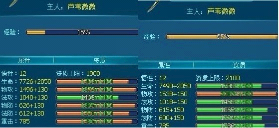 另外玩家要充分考虑是长期还是短期效应,如果是为了宠物榜冲级短期效应,1900的资质足矣。如果是为了以后长期角度,(因为GM不断在更新,后期还会出现2300-2500资质等等),比如:拿微微的宠物当个例子(微微帖子也说了耗费了大量元宝在宠物上),8服微微的1900熊猫侠当时基本上都是黄条了如左图(无敌的),可是现在融合成2100资质的宠物后变成如图: