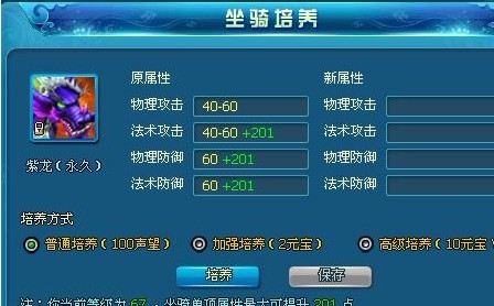 坐骑的培养:通过声望洗,最好有三个同时为绿色箭头再保存,天师(法功、法防、物防)同时为绿色保存。不支持用元宝洗,坐骑培养是一个持续的过程,随着人物等级的提高而增加属性值,所以用声望洗又不花钱又能达到目的。