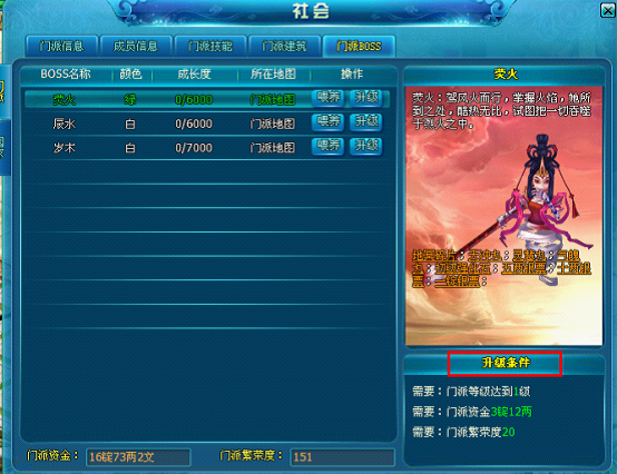 玩家可以通过门派使用门派资金和门派的繁荣度进行对门派BOSS的升级。击杀后可以随机地冥碎片,七魄材料等道具的,随着BOSS等级越高所获得的奖励也是越丰富的呢。(橙色的门派BOSS掉落地冥碎片的几率是100%的呢)